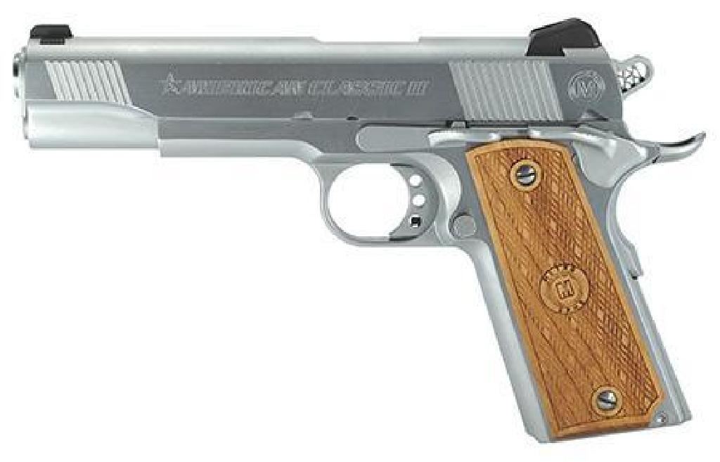 SPECIFICATIONS: Mfg Item Num: AC45G2C Category: PISTOLS Type :Pistol Action :Single Caliber :45 Automatic Colt Pistol (ACP) Barrel Length :5" Capacity :8+1 Safety :Thumb and Grip Grips :Hardwood Sights :Dovetail Front, Novak Rear Weight :37.28 oz Frame Finish :Hard Chrome Frame Material :4140 Steel Barrel Type :Throated/Forged Slide Description :Hard Chrome Case Type : Barrel Length Range :5.00" to 5.99" Weight Range :32.00 oz to 47.99 oz