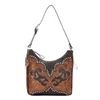 ZIP-TOP SHOULDER BAG: Exterior: Zip top closure. Hidden back wall compartment conceals valuables or defense weapon and has zipper openings on either side of the bag for access. Interior: Small zipper pocket and two pouches. Dimensions: 10 x 8.5 x 4.5 Strap: Adjustable, 11-13 inch drop. Includes a protective storage bag and silver signature keepsake. TRI-FOLD WALLET: Exterior: Snap closure. Back has zipper coin pocket. Interior: Full leather inside contains flap for checkbook, 13 card slots and 5 compartments. Dimensions: 7.5 x 4
