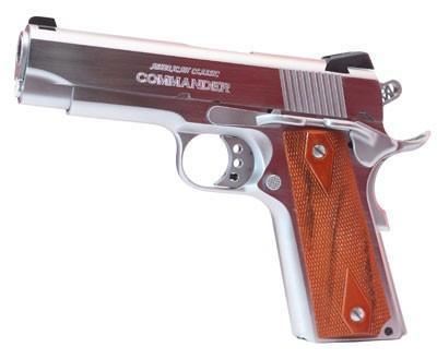 FAMILY:1911 Style Pistol Series  MODEL:American Classic Commander  TYPE:Semi-Auto Pistol  ACTION:Single Action  FINISH:Hard Chrome  STOCK/FRAME:Steel Frame  STOCK/GRIPS:Checkered Wood  CALIBER/GAUGE:45 ACP  CAPACITY:8+1  # OF MAGS:1  MAGAZINE DESC:8 rd.  BARREL:4.25"  OVERALL LENGTH:7.5"  SIGHTS:Fixed  SAFETY:Frame Mounted Safety