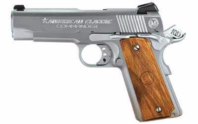 Mfr Items:American Classic Category:PISTOLS Model:1911 Series:Compact Commander Action:Single Caliber:45 Automatic Colt Pistol (ACP) Barrel Length:4.3" Capacity:7+1 Safety:Beavertail and Thumb Grips:Hardwood Sights:Dovetail Front, Novak Rear Weight:34.6 oz Frame Finish:Blued Frame Material:Steel Barrel Type:Throated/Forged Slide Description:Hard Chrome