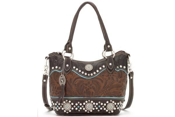 THREE PIECE HAYLOFT COLLECTION INCLUDES: CONVERTIBLE ZIP-TOP BUCKET TOTE 11 x 8.5 x 5 ACCESSORY CASE 9 x 4.5 x 3 TRI-FOLD WALLET 7.5 x 4 Wallet Hand Tooled Vegetable Tanned Leather Snap closure Flap for checkbook 13 Card slots 5 Compartments Back zipper coin pocket Silver signature keepsake Accessory Case Hand Tooled Vegetable Tanned Leather Clear vinyl lining Zipper closure Convertible Zip-Top Tote Hand Tooled Vegetable Tanned Leather Dual carry handles Removable, adjustable shoulder strap Back zipper pocket Top main zipper opening Interior zip pocket and two interior accessory pockets Silver signature keepsake With a flair for the dramatic, this collection is sure to turn heads with its glistening decorations and splash of turquoise. Dare to dazzle with this two toned chocolate and chestnut brown collection, accented with sky blue leather trim and the perfect amount of silver and turquoise spots. .