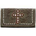 ZIP-TOP SHOULDER BAG: Exterior: Zip top closure. Hidden back wall compartment conceals valuables or defense weapon and has zipper openings on either side on the bag, for access. Fully lined in leather. Pocket will fit barrel up to 10 inches and grip up to 6 inches. Interior: Small zipper pocket and two pouches. Dimensions: 11 x 8.5 x 3.5 Strap: Adjustable, 13-16 inch drop. Includes a protective storage bag and silver signature keepsake. TRI-FOLD WALLET: Exterior: Snap closure. Back has zipper coin pocket. Interior: Full leather inside contains flap for checkbook, 13 card slots and 5 compartments. Dimensions: 7.5 x 4