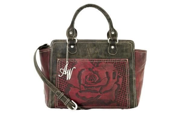 ZIP-TOP PURSE Hand tooled and hand-stained rose detail surrounded by basket weave tooling Dual carry handles with a 5" drop length Adjustable shoulder strap with a 25" drop length Zip-top opening American West signature cotton lining Interior zipper pocket and two pouches Silver signature keepsake Protective storage bag 8.5" x 13.0" x 4.5" WALLET Hand tooled and hand-stained rose detail surrounded by basket weave tooling Snap closure Fully lined leather 13 Card slots Flap for checkbook 5 Compartments Back zipper coin pocket 4" x 7.5" x 1.0"