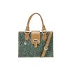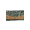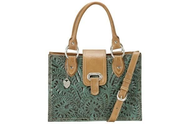 American West Graciebird Three Compartment Tote: Hand tooled vegetable tanned leather Dual leather carry handles Removable, adjustable shoulder strap Magnetic flap closure Three interior compartments Interior zip pocket Two interior accessory pouches Silver signature keepsake Protective storage bag Dimensions 8" x 11.0" x 5.0" American West Graciebird Ladies' Tri-Fold Wallet: Hand tooled vegetable tanned leather Snap closure 13 Card slots Checkbook flap 5 Compartments Back zipper coin pocket Dimensions 7.5" x 4" x 0.5"