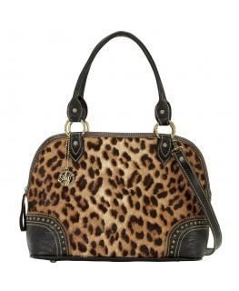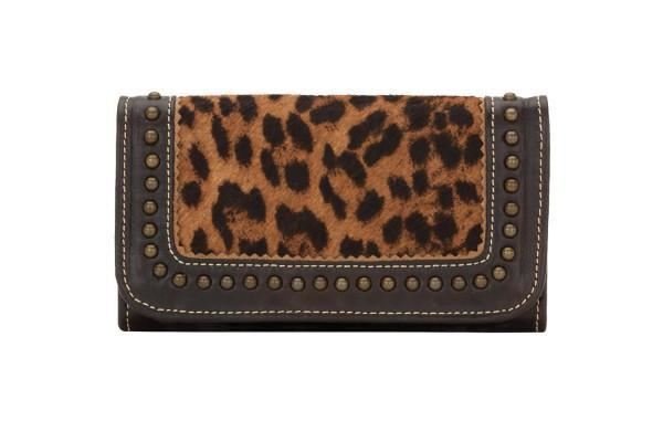 ZIP AROUND SATCHEL Hair-on cowhide surrounded by hand tooled leather Colored spots and hardware details Rolled handles with a 7" drop length Adjustable, detachable shoulder strap with a 25" drop length Back zipper pocket Zipper closure Interior zip pocket and two slip pockets Signature keepsake Protective storage bag TRI-FOLD WALLET Hand Tooled Vegetable Tanned Leather Snap closure Flap for checkbook 13 Card slots 5 Compartments 5 Compartments Back zipper coin pocket