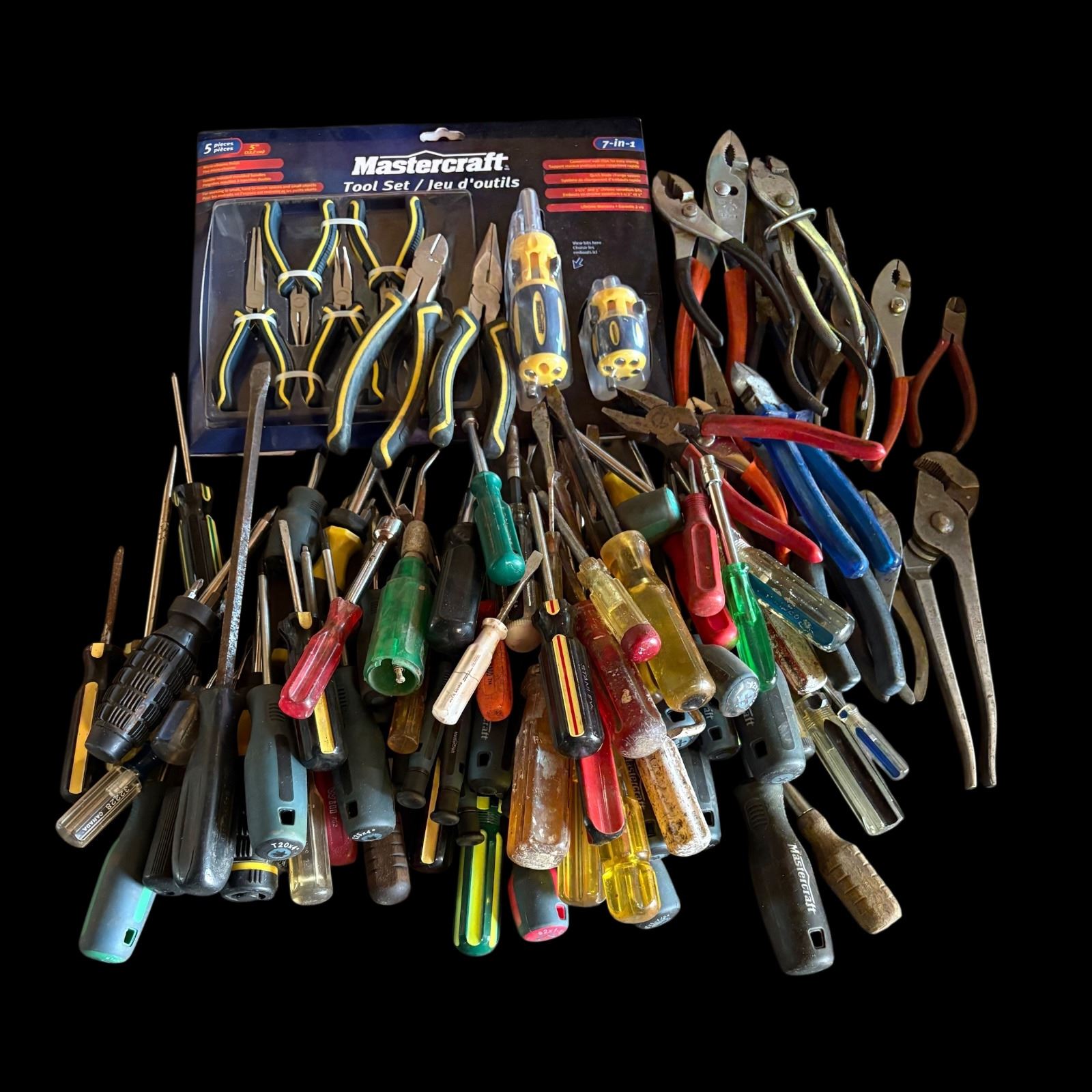 NEW AND USED MASTERCRAFT PLIERS PLUS HUGE ASSORTMENT USED SCREW DRIVERS