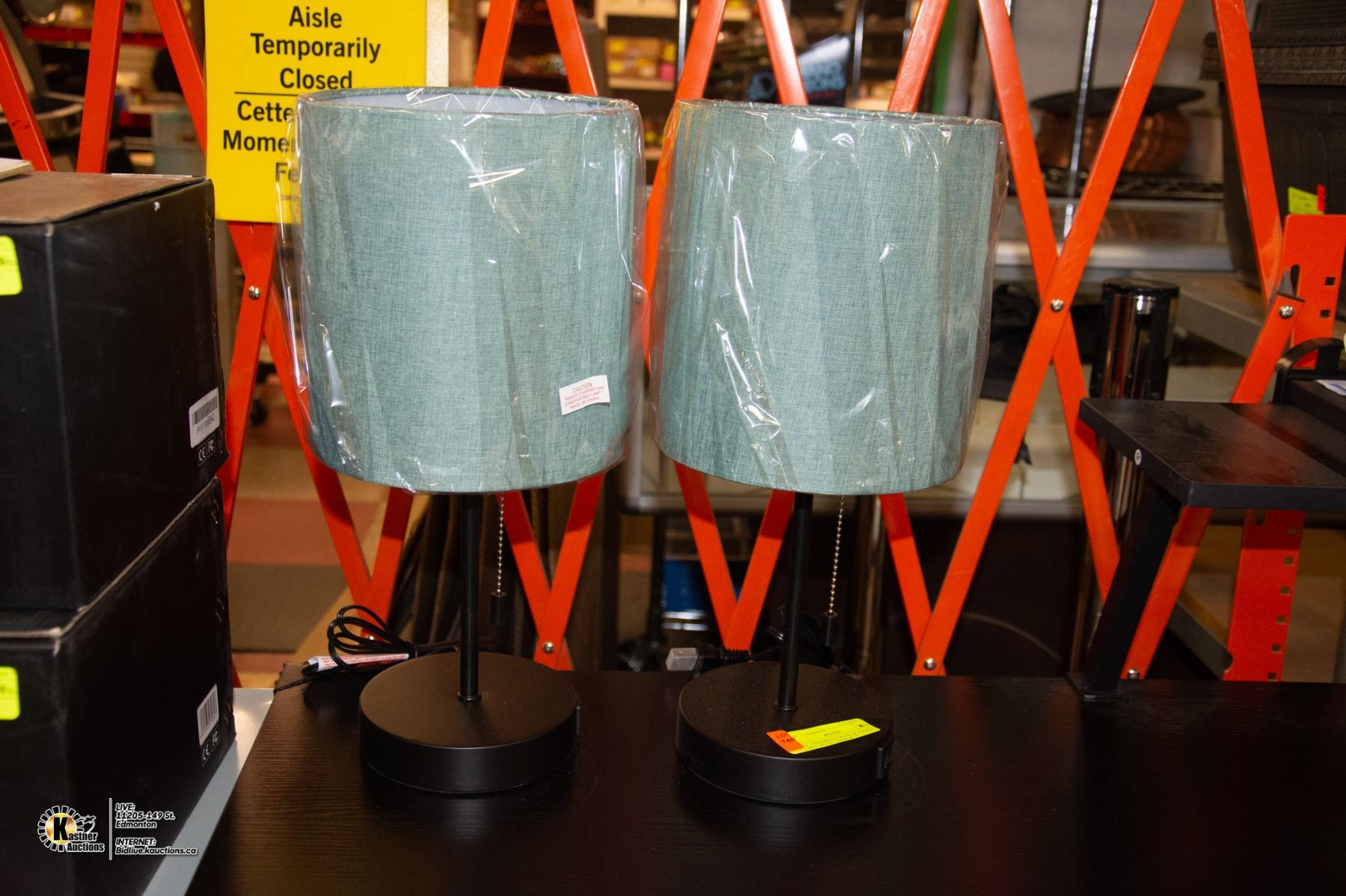 NEW ASSEMBLED PAIR OF TABLE LAMPS, WITH USB PORTS LIGHT GREEN