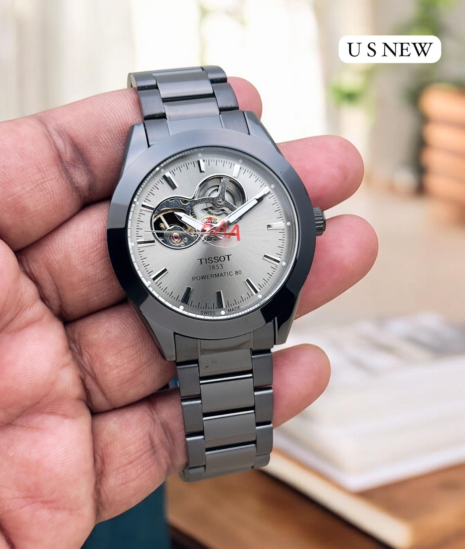 NEW AUTOMATIC TISSOT 1853 POWERMATIC 80 REPLICA WATCH. SILVER DIAL WITHS STAINLESS STELL MARKERS. GREY STAINLESS-STEEL BEZEL, CASE AND BRACELET. WATCH IN BOX.