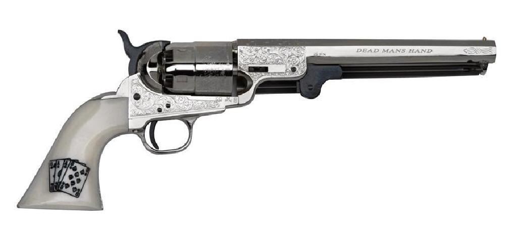 Aces and Eights Revolver Features: .44 Caliber 7.375" Old Silver Octagonal Barrel Old Silver Guard Simulated Ivory Grip Old Silver Frame Hammer/Blade Sights Overall Length: 13.5" Weighs 2.75 pounds