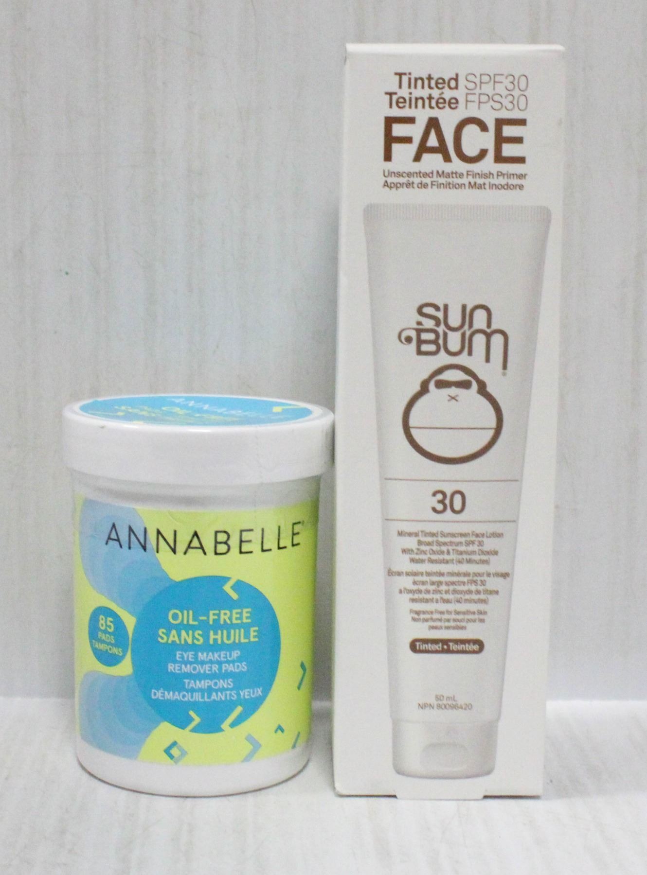 ANNABELLE OIL FREE EYE MAKEUP REMOVER PADS AND BOTTLE OF SUN BUM TINTED SPF30 FACE SUNSCREEN LOTION, AMZ SES