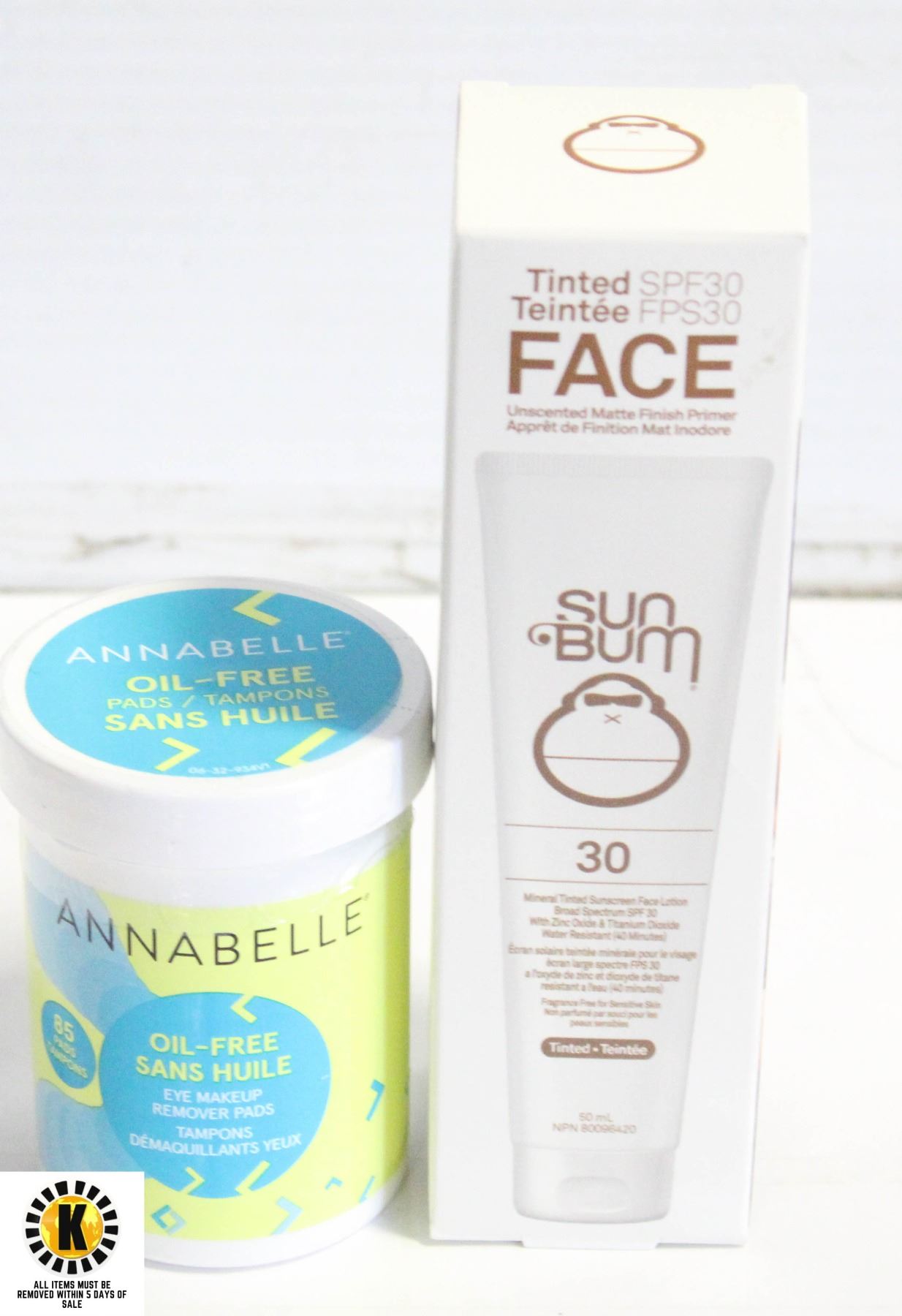 ANNABELLE OIL FREE EYE MAKEUP REMOVER PADS AND BOTTLE OF SUN BUM TINTED SPF30 FACE SUNSCREEN LOTION, AMZ SES