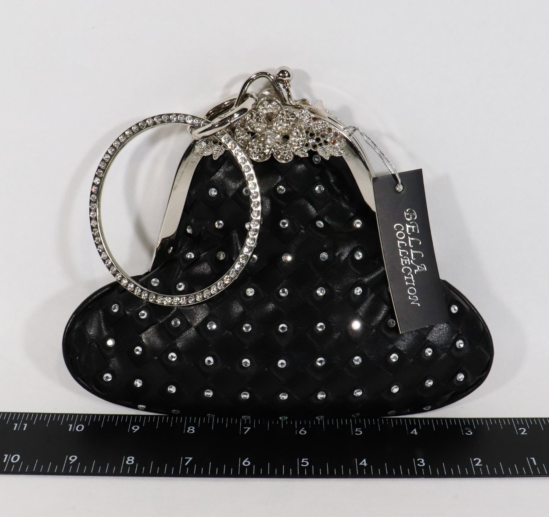TRIANGLE SHAPE BLACK LEATHERETTE RHINESTONE ACCENTED (COMES WITH SOME RHINESTONE REPLACEMENTS)EVENING BAG. HAS DETACHABLE METAL HAND BAG STRAP