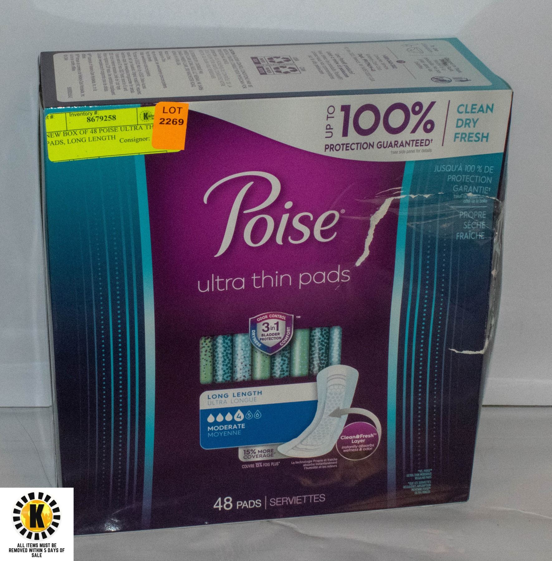 NEW BOX OF 48 POISE ULTRA THIN PADS, LONG LENGTH