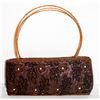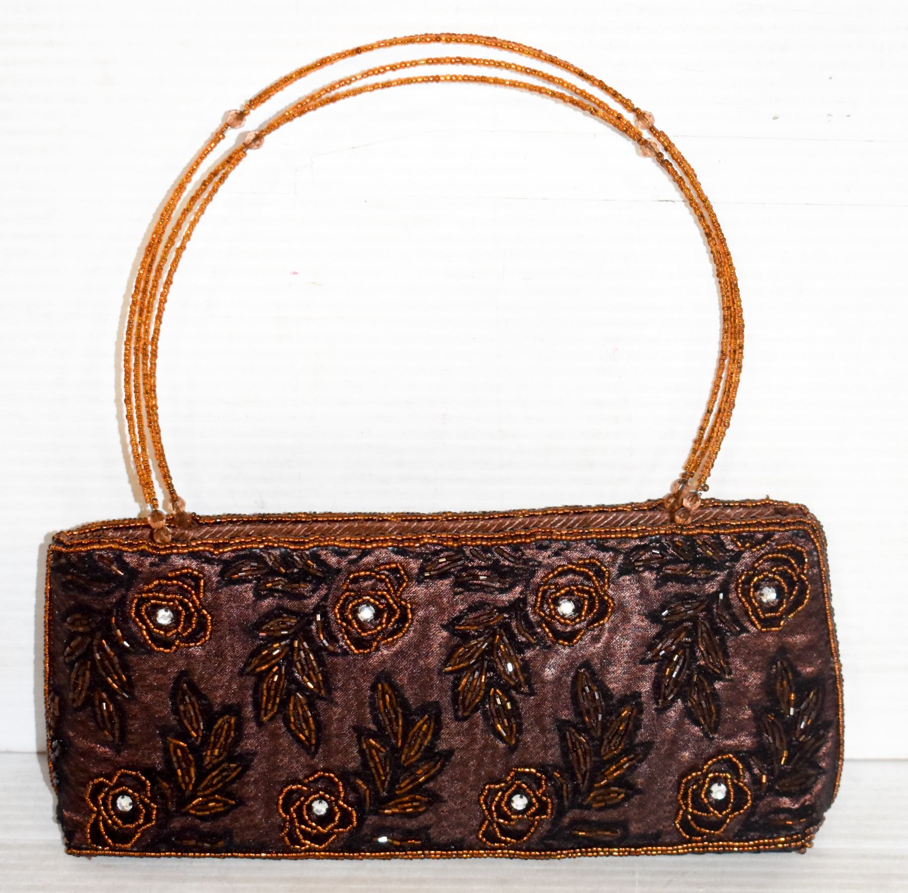 NEW BROWN BEADED FLORAL CLUTCH BAG, 9.5 INCHES WIDE X 4 INCHES TALL, PLUS 6 INCH TALL DUAL STRAND BEADED HANDLES, WITH MOUNTED RHINESTONES ALL BEADS AND STONES INTACT. PURSE.