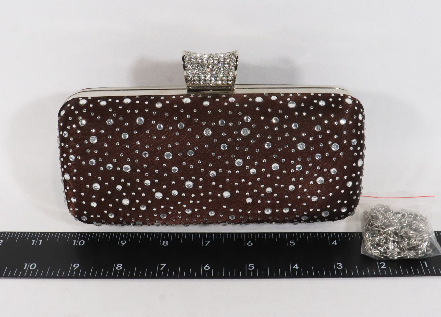 HANDBAG. HAS DETACHABLE WRISTLET AND SHOULDER HANDBAG CHAINS. KISS LOCK HAS RHINESTONE ACCENTS