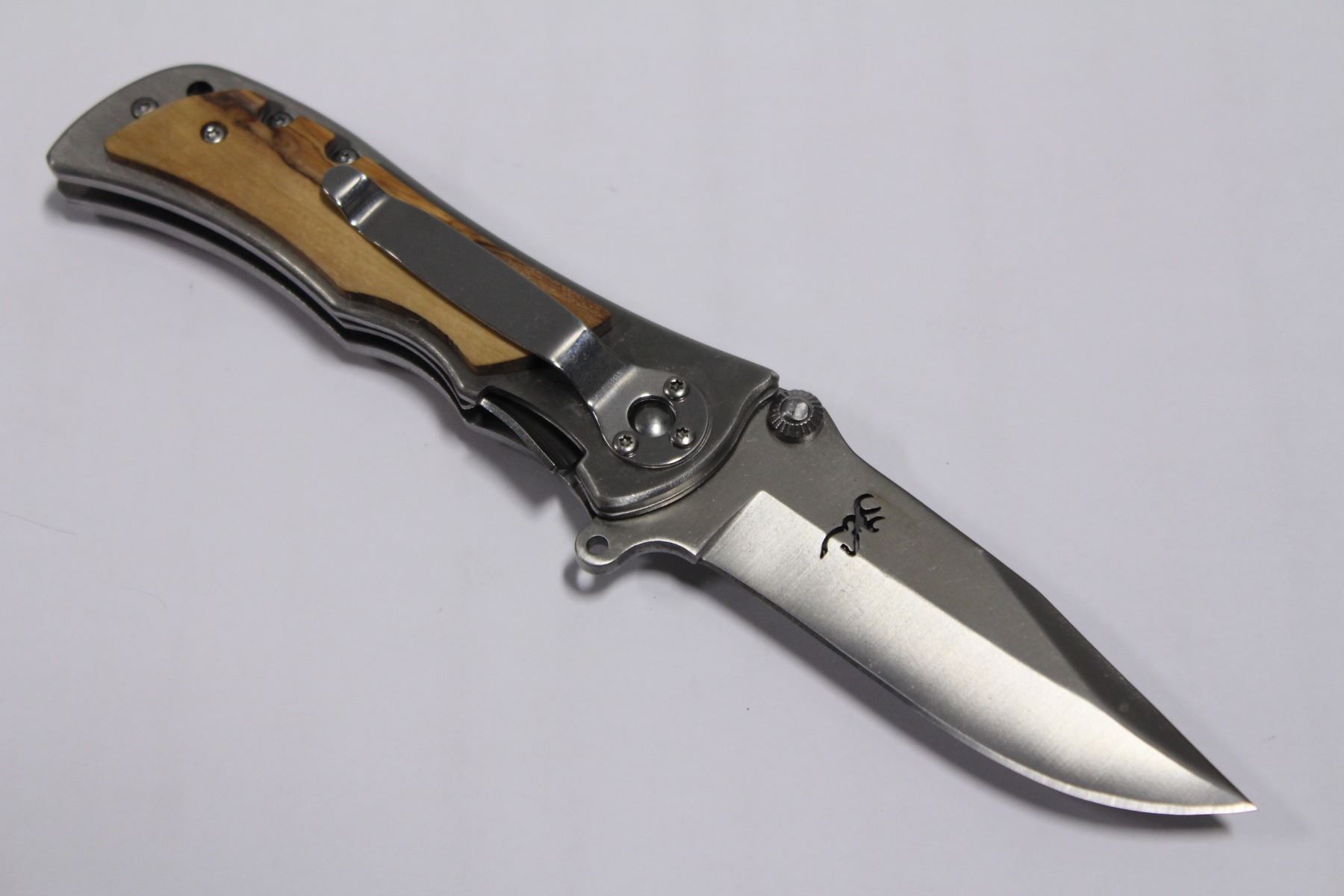 3.5" BLADE, RIVETED REINFORCED STEEL HANDLE W/ WOODEN PLATE, QUICK FLIP TAB W/ LOOPHOLE, EASY PRESS SAFETY RELEASE LOCK. HEAVY. STAINLESS STEEL FINISH.