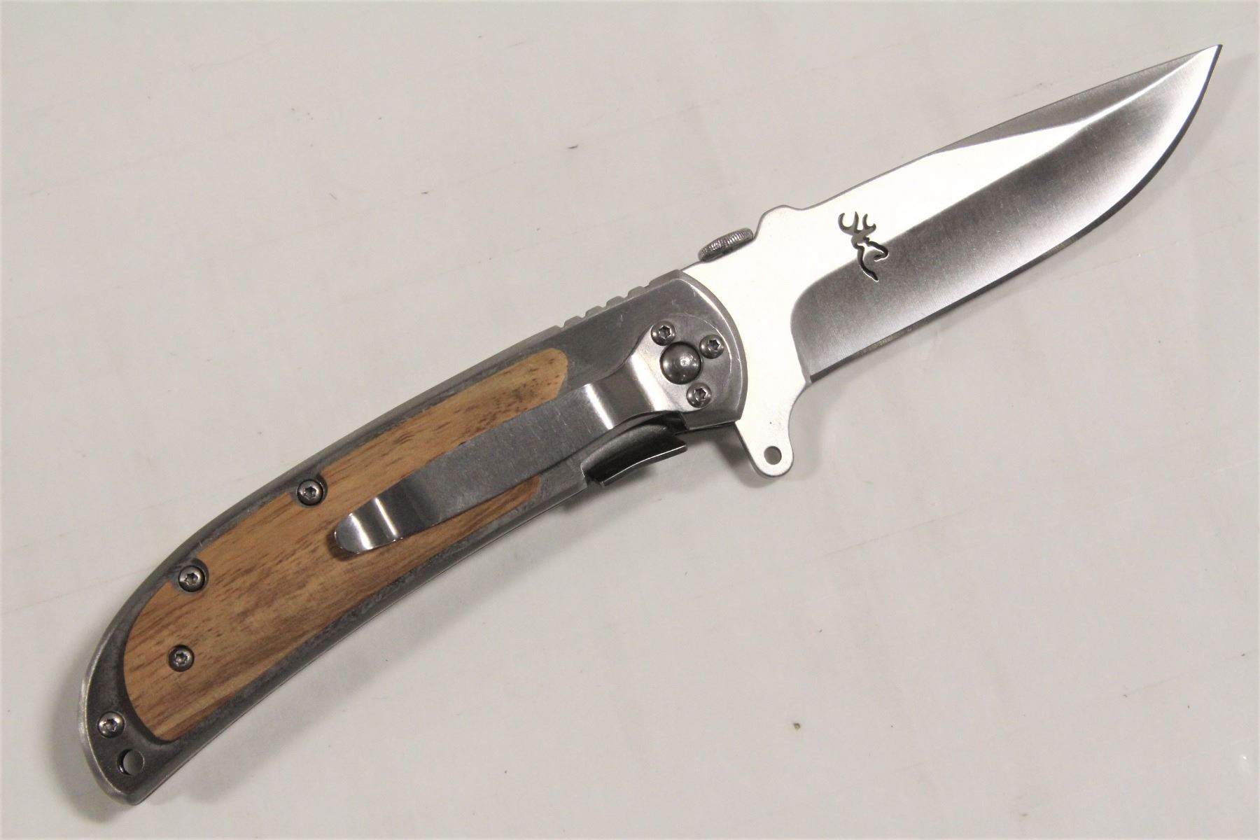 3.5" BLADE, RIVETED REINFORCED STEEL HANDLE W/ WOODEN PLATE, QUICK FLIP TAB W/ LOOPHOLE, EASY PRESS SAFETY RELEASE LOCK. HEAVY. STAINLESS STEEL FINISH.