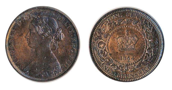 NEW BRUNSWICK. One Cent. 1864. Long 6. Re-Engraved '8' and '6' in date. Mint State-62. Red-Brown. 30% luster