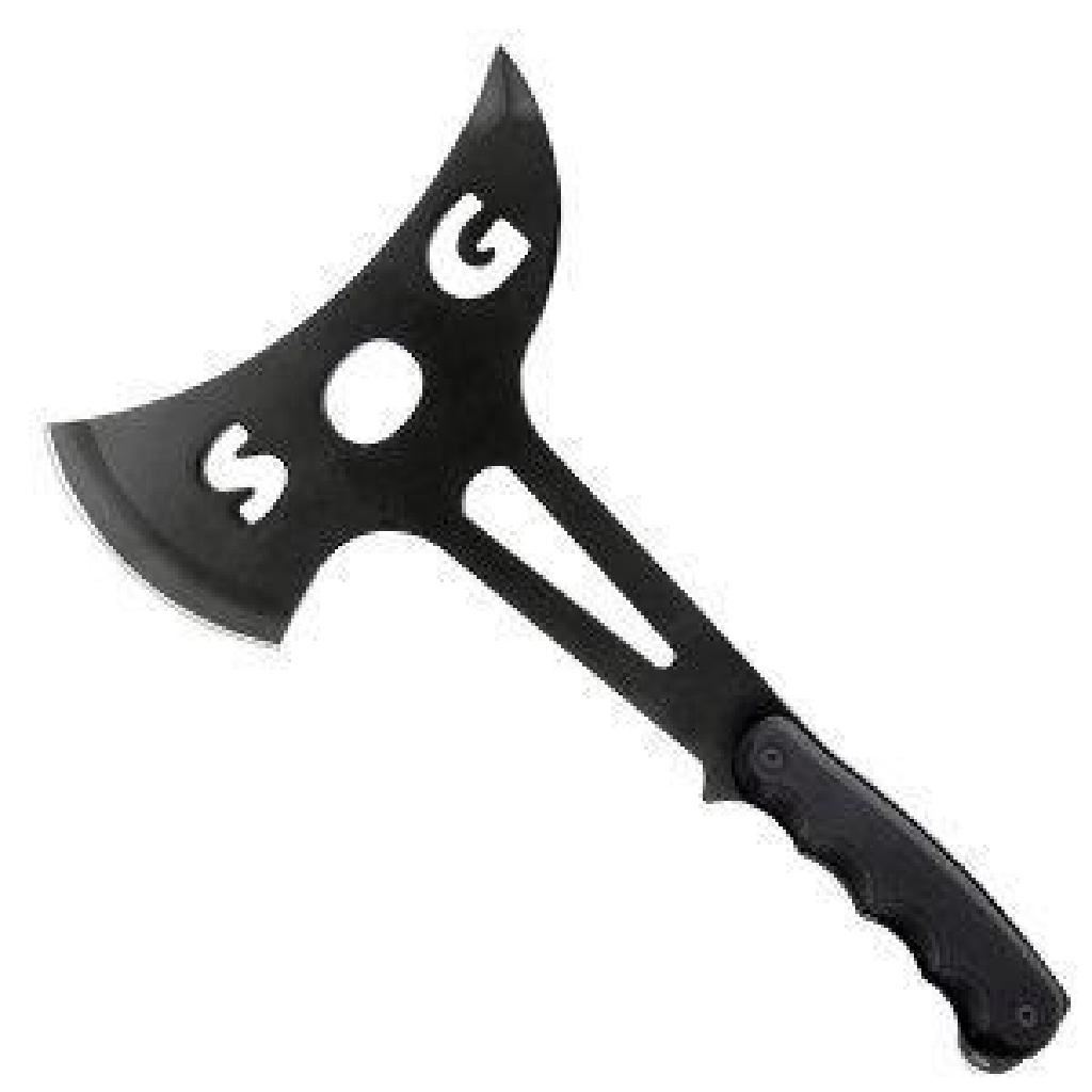 Short Description Battle Ax, Black G10 Handle, Black Blade w/Sheath Long Description Our modern battle/throwing axe evokes its origins from medieval times, which some might consider to be the present. Whether used as a target axe, SWAT tool, universal back up, or hung above the fireplace; it is very effective. The pike in the back is upswept for better target penetration. Size and heft are balanced for optimum swing control. The handle is made from G10 and the entire solid blade is protected with SOG's Hardcased coating. Features Overall length: 12.25 in. Blade material: 420 Handle material: G10 Weight: 20.20 oz. Features: hardcased black nylon sheath