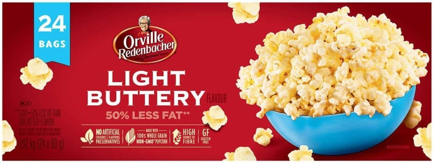 ORVILLE REDENBACHER POPCORN 50% LESS FAT, 80 GRAM X 24 PACKS, BB AUGUST 5, 2023. AMZ SES