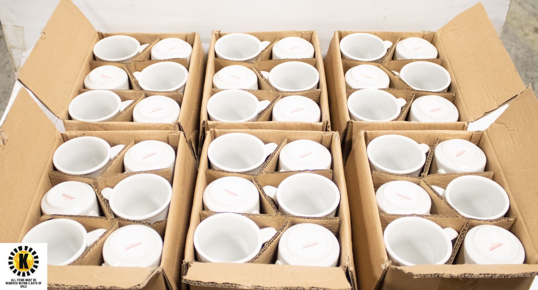 NEW CASE OF 3 DOZ 8OZ RED LOGO CAFE MUGS