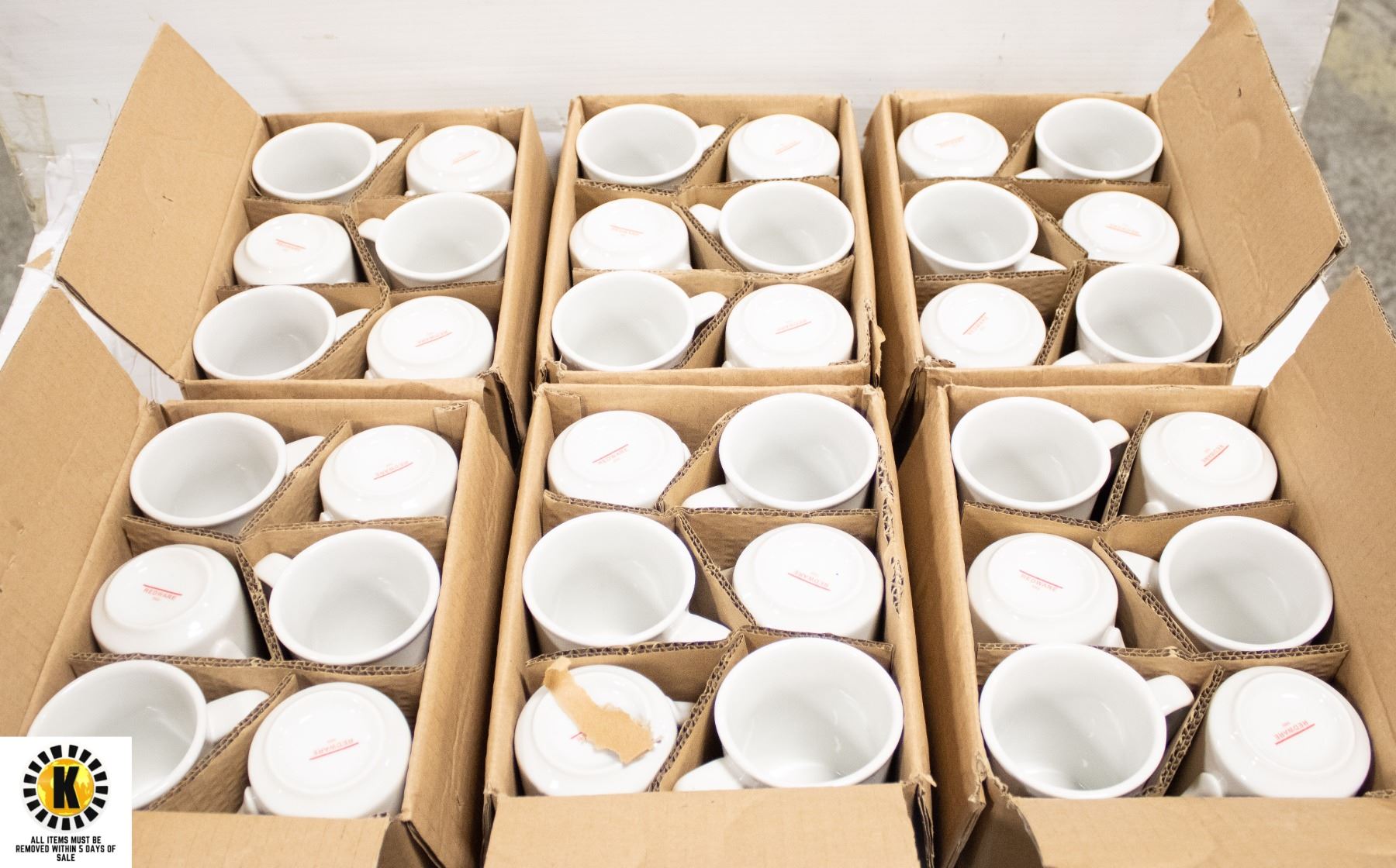 NEW CASE OF 3 DOZ 8OZ RED LOGO CAFE MUGS