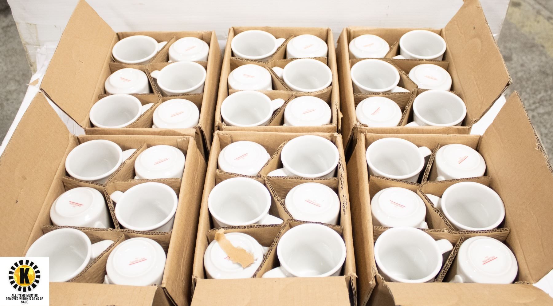 NEW CASE OF 3 DOZ 8OZ RED LOGO CAFE MUGS