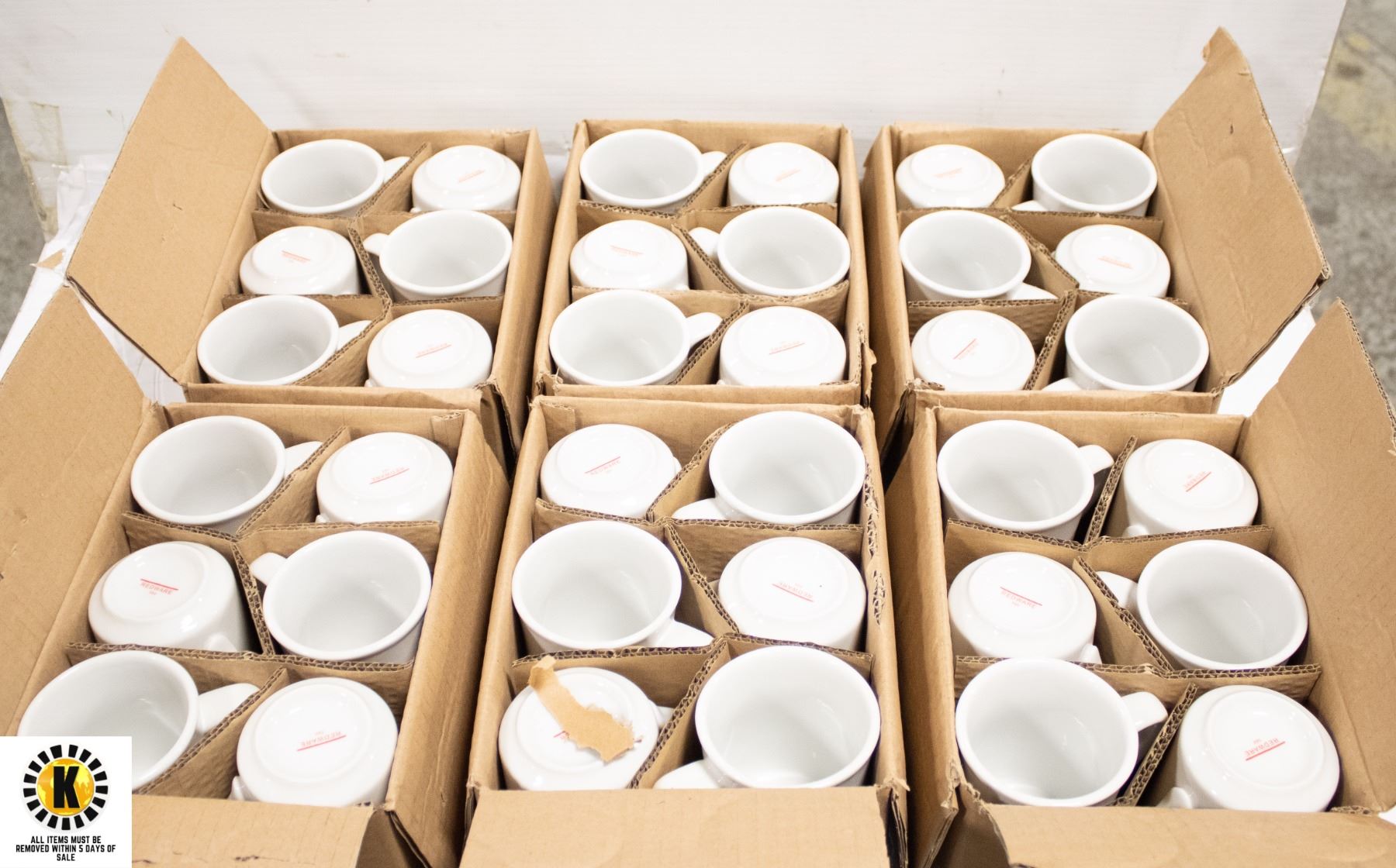 NEW CASE OF 3 DOZ 8OZ RED LOGO CAFE MUGS