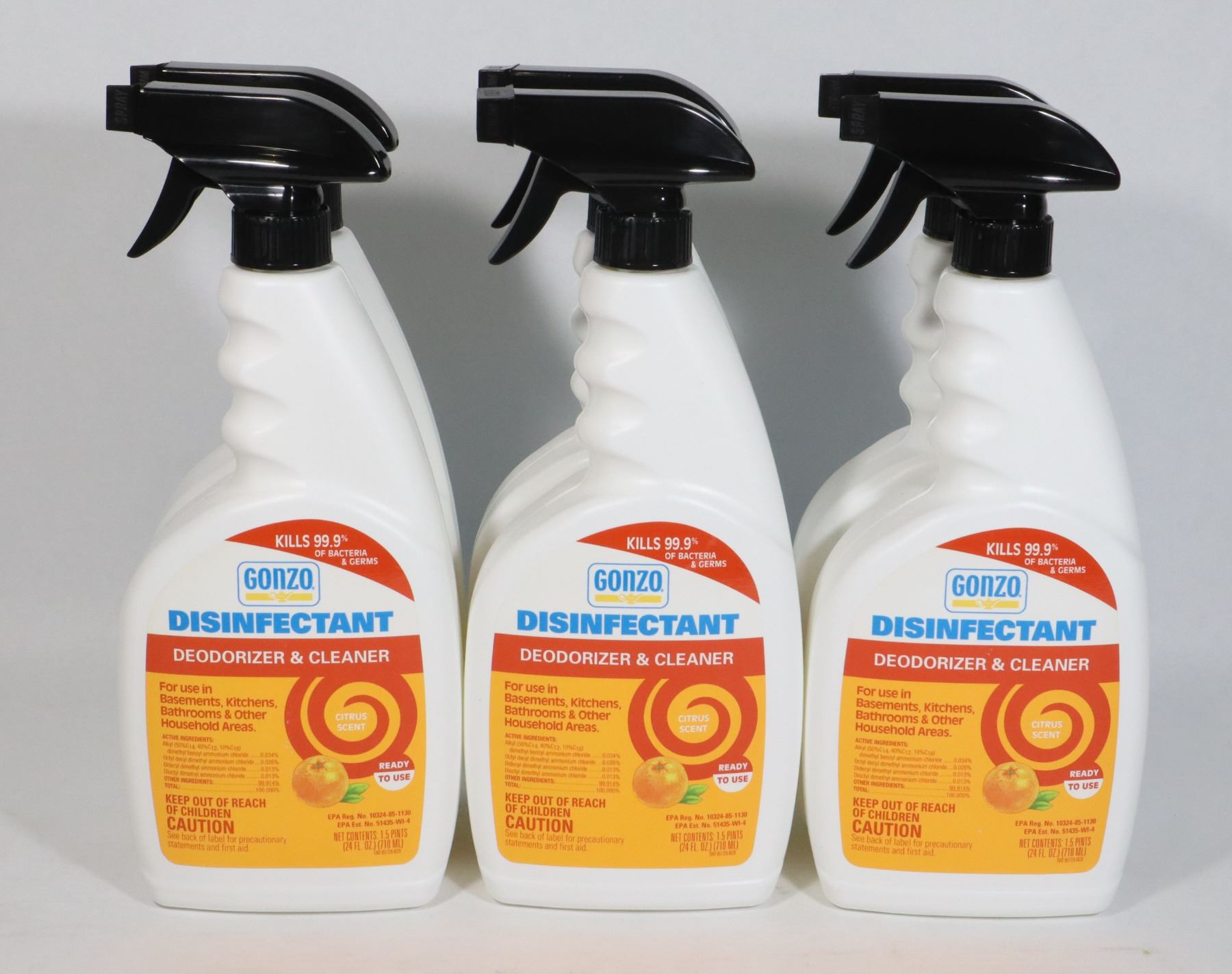 AND CLEANER SPRAY BOTTLE. CITRUS SCENT. 710ML EACH (24 FL OZ). SOME SEEPAGE IN TRANSPORT, CARDBOARD SLIGHTLY DAMAGED, BOTTLES ALL NEW/ UNDAMAGED