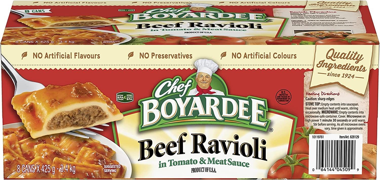BEEF RAVIOLI IN TOMATO & MEAT SAUCE, 8 X 425G CANS, BB AUG14 2023, AMZ SES