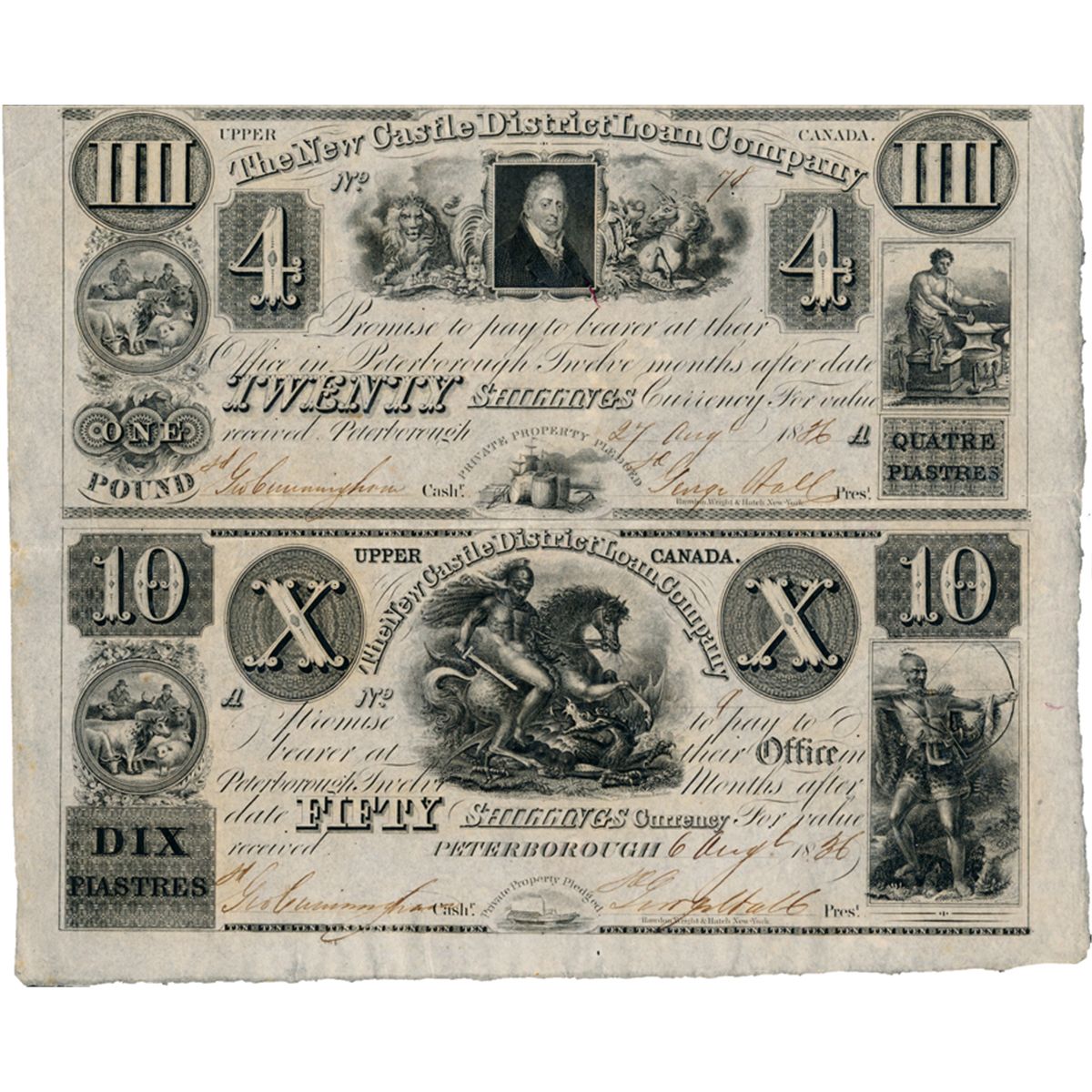 NEW CASTLE DISTRICT LOAN COMPANY. An uncut half sheet. $4.00, $10.00. CH-525-10-06, CH-525-10-08. The $4.00 is dated 27 Aug., 1836 and numbered 78/A. The $10.00 is dated 6 Aug., 1836 and serial numbered 9/A. Large margins. Extra Fine+.