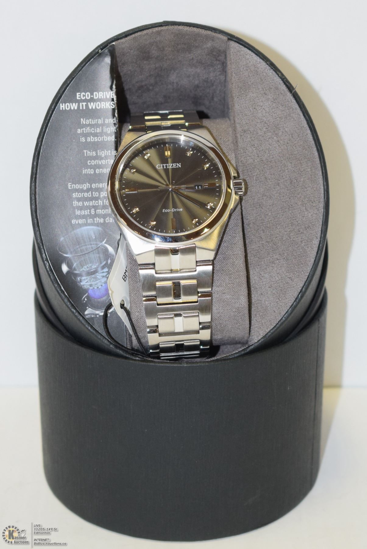 DATE. ECO-DRIVE. AUTHENTIC. IN AN ORIGINAL BOX & WITH TAGS. 46 MM CASE. LARGE ST. STEEL BAND (CAN BE MADE SMALLER)