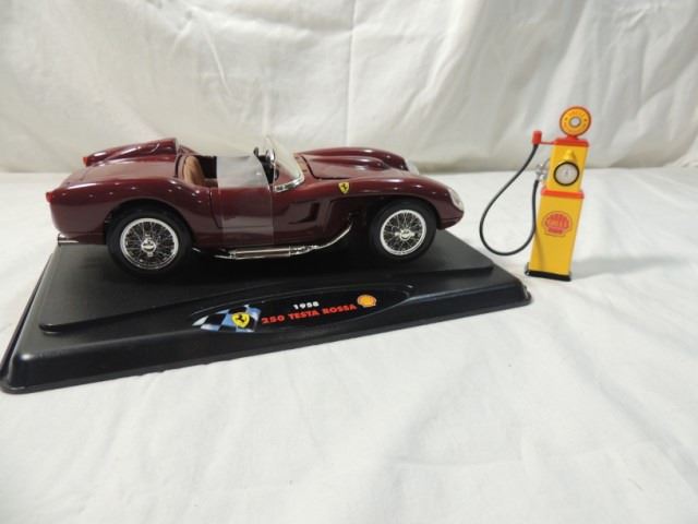 BRAND NEW, NEVER REMOVED FROM THE BOX, DIE CAST MODEL CAR. 1958 FERRARI 250 TESTA ROSSA AND DIE CAST ROAD FUEL PUMP. SHELL OIL GASOLINE PETROLIANA. FIRESTONE ON DISPLAY BASE. AS SHOWN.