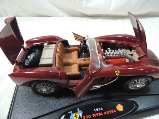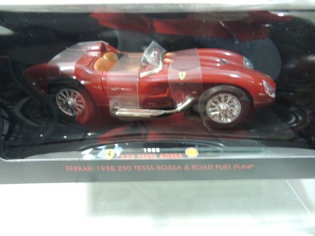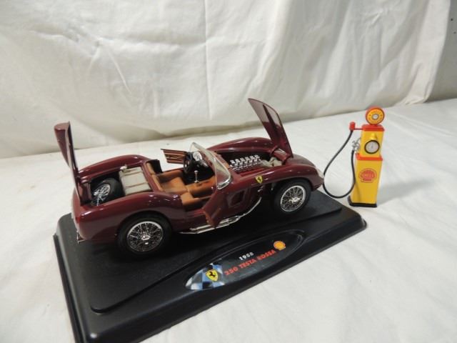 BRAND NEW, NEVER REMOVED FROM THE BOX, DIE CAST MODEL CAR. 1958 FERRARI 250 TESTA ROSSA AND DIE CAST ROAD FUEL PUMP. SHELL OIL GASOLINE PETROLIANA. FIRESTONE ON DISPLAY BASE. AS SHOWN.
