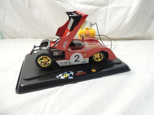 BRAND NEW, NEVER REMOVED FROM THE BOX, DIE CAST MODEL CAR. 1972 FERRARI 312 P AND DIE CAST RACING PUMP. SHELL OIL GASOLINE PETROLIANA. FIRESTONE TAG HEUER MARIO ANDRETTI. ON DISPLAY BASE. AS SHOWN.