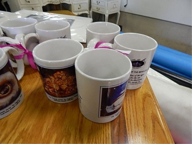 NEW COFFEE MUGS - ART BY EUGENE PENTZ - 4 MUGS PER LOT - 1 OF EACH - GALAXY REUNION, COSMIC FREINDSHIP, ODYSSEY FROM ANCESTORS MEMORY & IN THE EYE OF THE BEHOLDER - PINK RIBBON