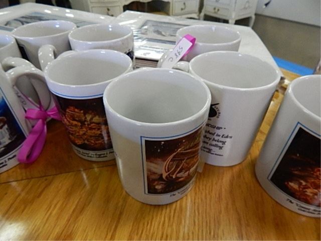 NEW COFFEE MUGS - ART BY EUGENE PENTZ - 4 MUGS PER LOT - 1 OF EACH - GALAXY REUNION, COSMIC FREINDSHIP, ODYSSEY FROM ANCESTORS MEMORY & IN THE EYE OF THE BEHOLDER - PINK RIBBON