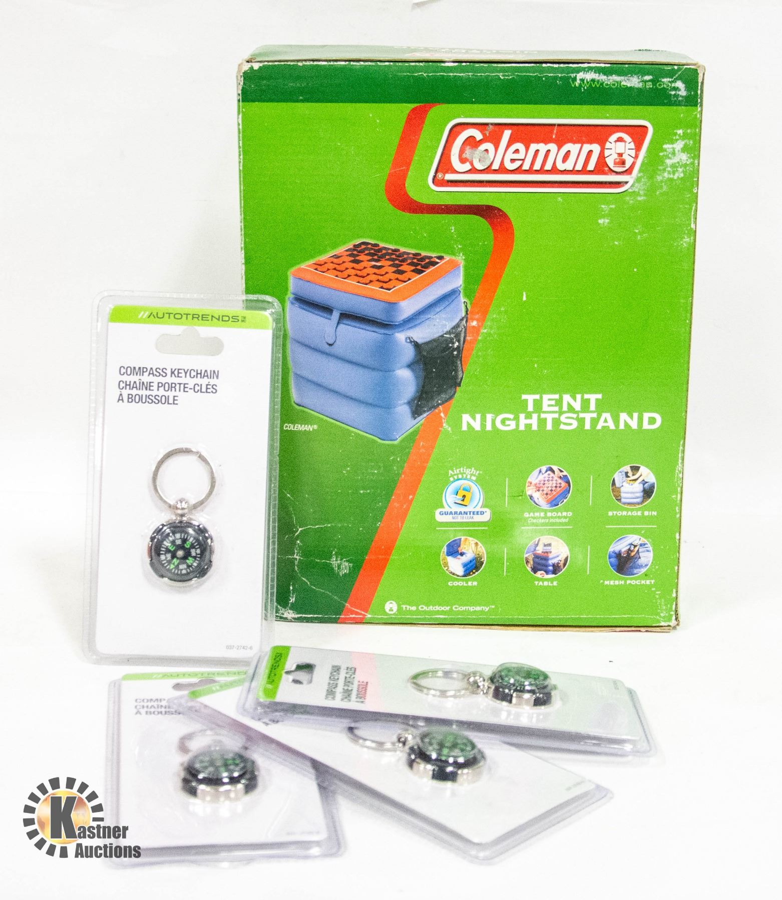 NIGHTSTAND COOLER W/NEW 4 AUTO TRENDS COMPASS KEYCHAINS     **ALL ITEMS MUST BE REMOVED BY 5PM SATURDAY, JULY 8ST 2023. ALL REMAINING ITEMS WILL BE SUBJECT TO A $6.00 PER DAY STORAGE CHARGE. ANY ITEMS REMAINING AFTER MONDAY, JULY 24TH, 2023 WILL BE CONSIDERED FORFEITED. NO REFUNDS WILL BE ISSUED FOR FORFEITED ITEMS. TO SCHEDULE A PICK UP APPOINTMENT CLICK HERE