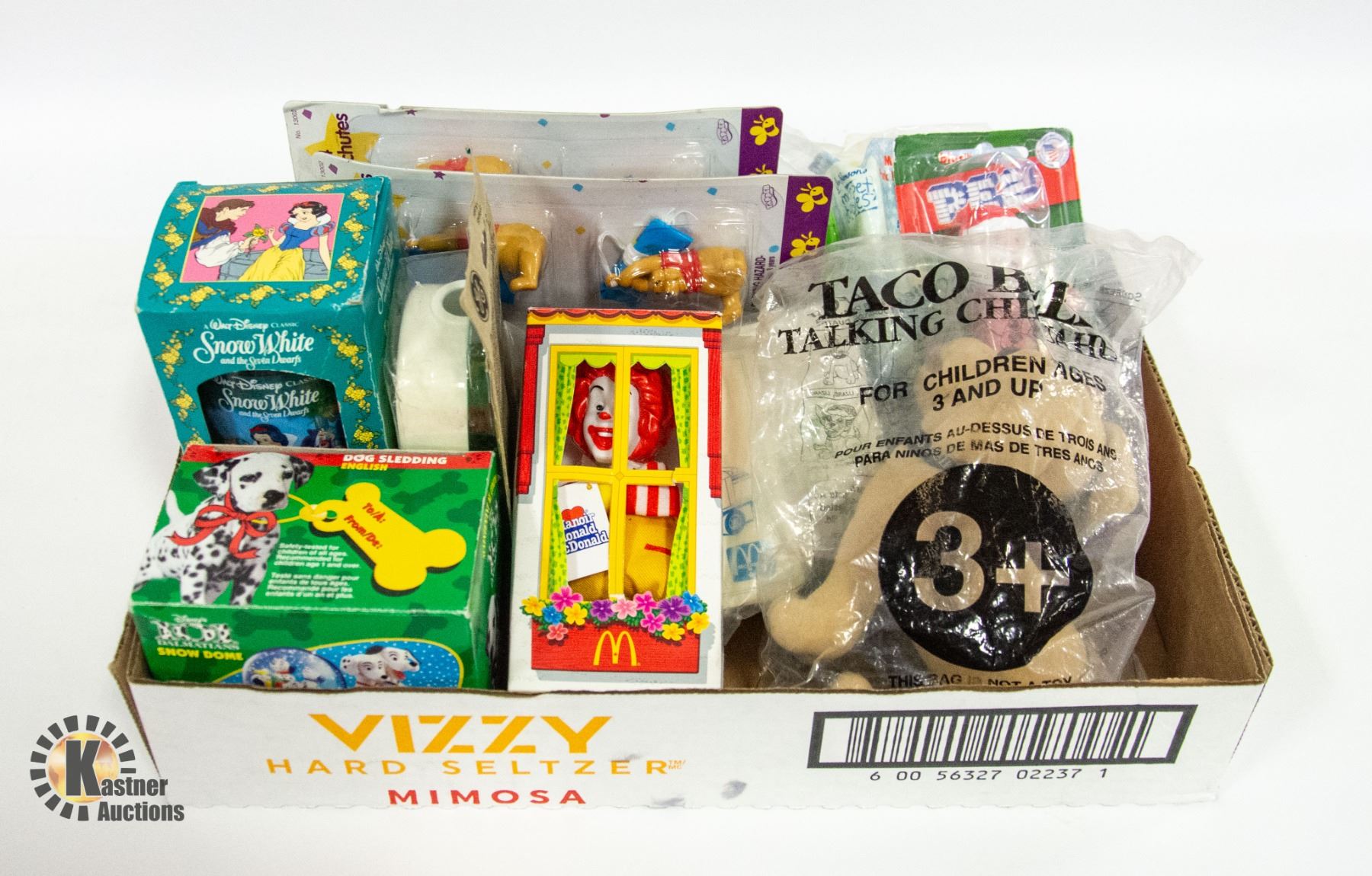 TALKING CHIHUAHUA, LOONEY TUNES NIGHTLIGHT, DAIRY QUEEN MUPPET BABIES, SNOW WHITE COLLECTOR GLASS & 3 MCDONALDS PEANUTS CHARLIE BROWN 1999, SNOW GLOBE DOME 101 DALMATION, MUPPET BABIES BABY KERMIT
