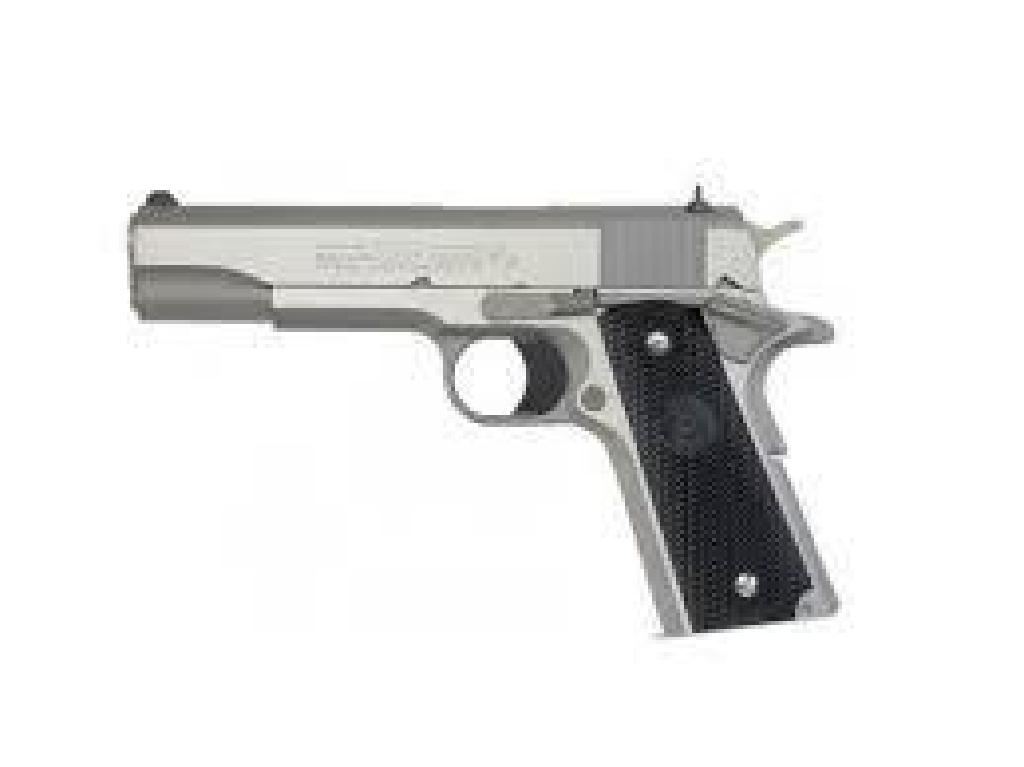 FAMILY:1911 Style Pistol Series MODEL:1991 Government TYPE:Semi-Auto Pistol ACTION:Single Action FINISH:Stainless STOCK/FRAME:Steel Frame STOCK/GRIPS:Black Rubber CALIBER/GAUGE:9mm CAPACITY:8+1 BARREL:5" OVERALL LENGTH:8.5" SIGHTS:White Dot ADDL INFO:Checkered Rubber Grip