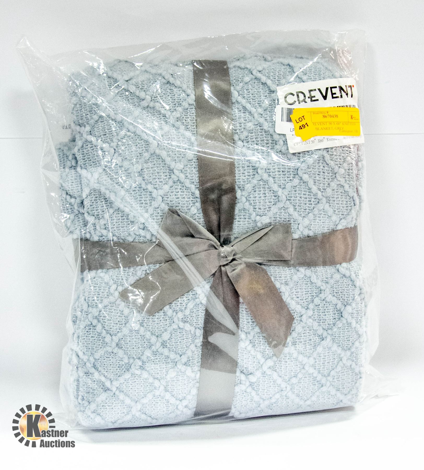 NEW CREVENT 50 X 60" KNITTED THROW BLANKET, GREY