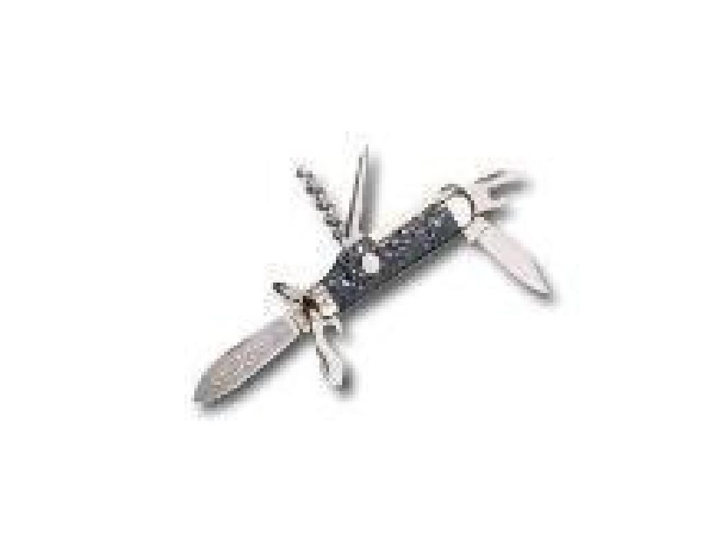 Features Blade length: 2.50 & 1.75 in. Closed length: 3.50 in. Blade material: 440C Handle material: Derlin Weight: 3.30 oz. Features: can opener, cap lifter, reamer, cork screw, flathead screwdriver and leather sheath