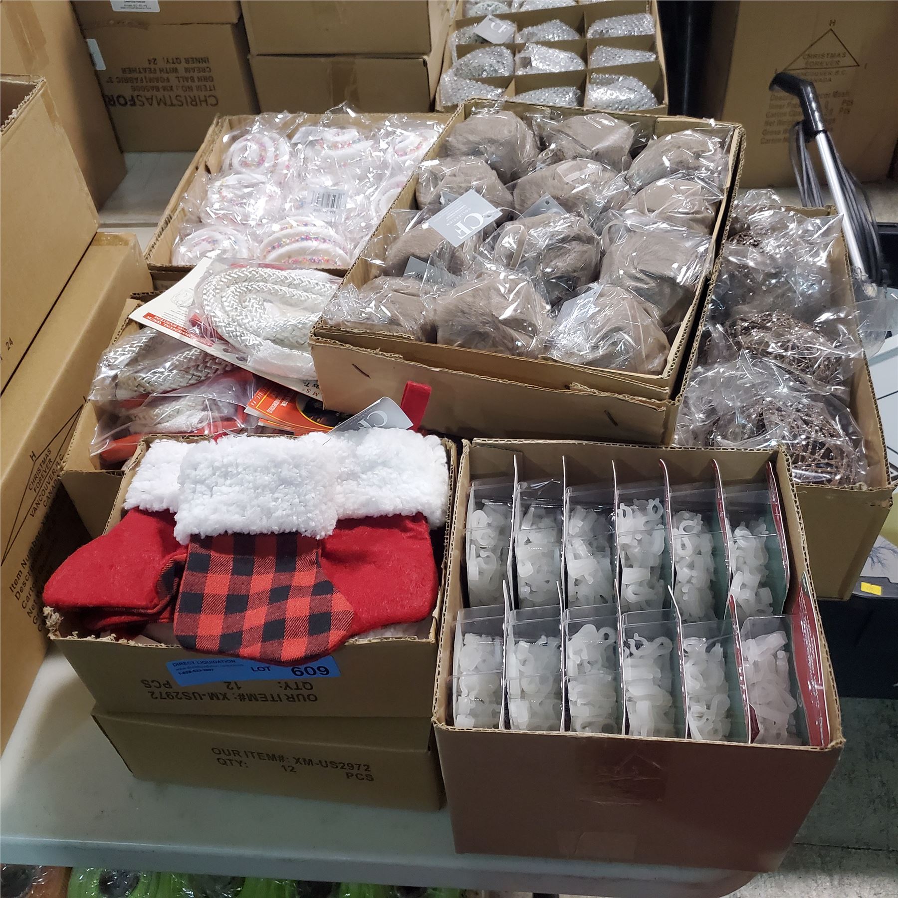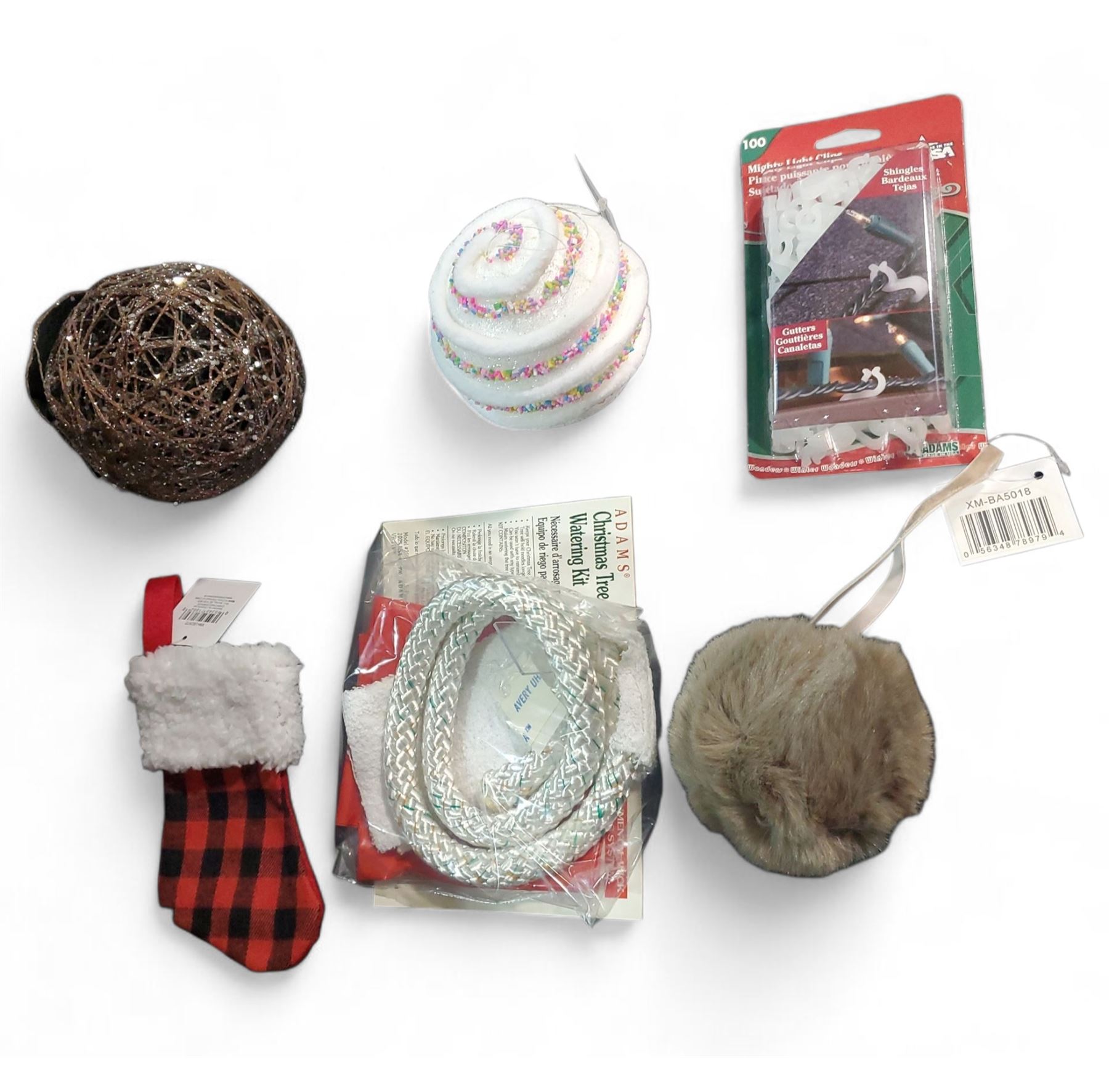 NEW Christmas Deco - includes Socking Tree Ornaments (24 pcs)/Mighty Light Clips (12 Boxes of 100 pcs) & More
