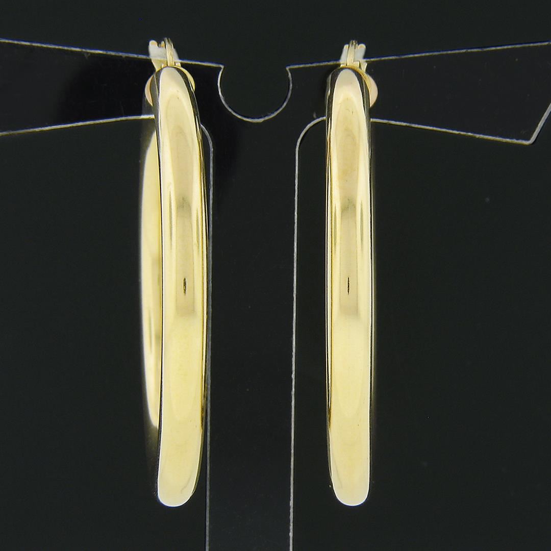 A new solid 14k yellow gold pair of hoop earrings. The earrings measure approximately 39.85mm in diameter and weigh a total of 4.85 grams.