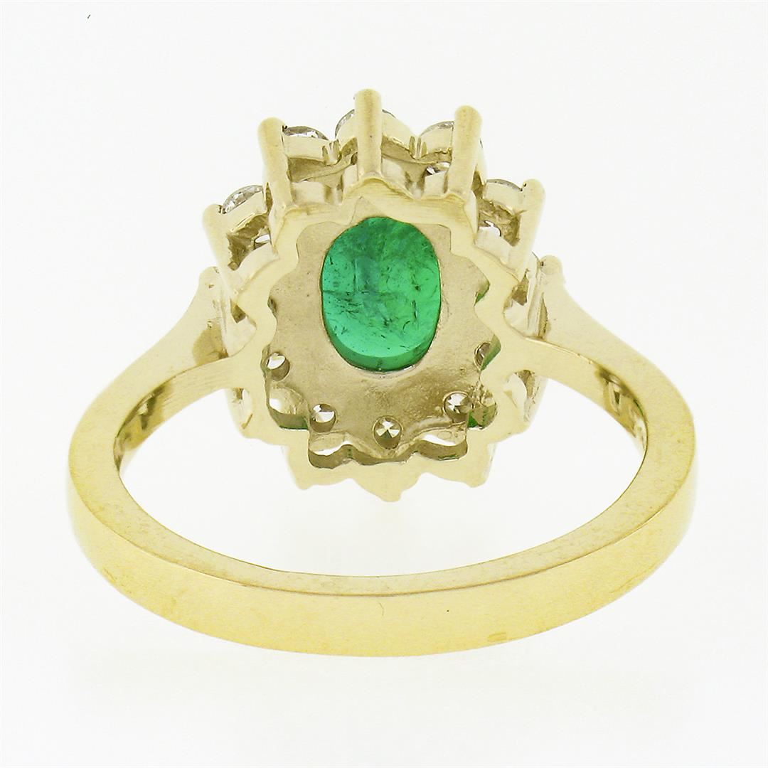A new solid 14k yellow gold ring, with 1 oval cut natural emerald (1.45ct), surrounded with a halo of 12 round brilliant cut natural diamonds (G/H - VS1/VS2 ; 0.57ctw). The ring is size 6.0, weighs a total of 4.77 grams, and measures 14.10mm wide.