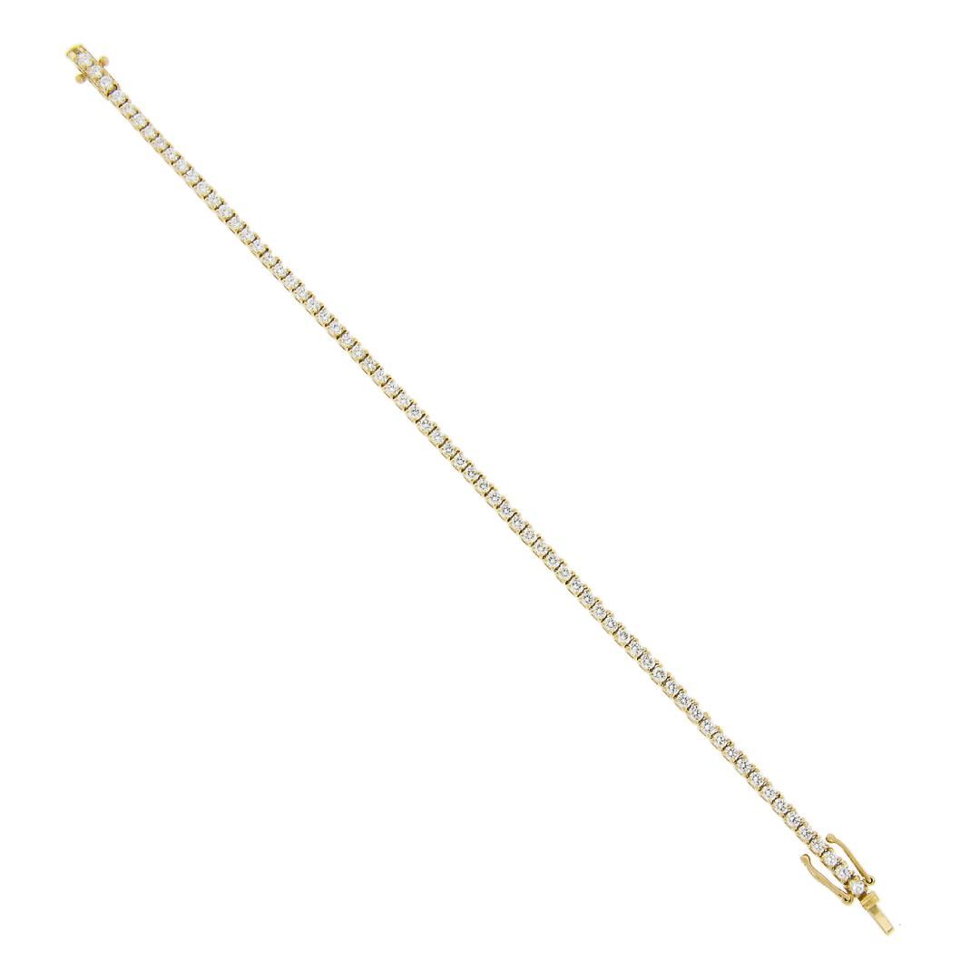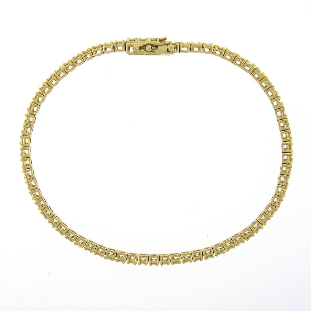 A new solid 14k yellow gold tennis bracelet, with 68 round brilliant cut natural diamonds (E/F- VVS2/VS1 ; 3.23ctw). It weighs a total of 7.64 grams, measures 2.6mm wide, and measures 6.75 inches in length.