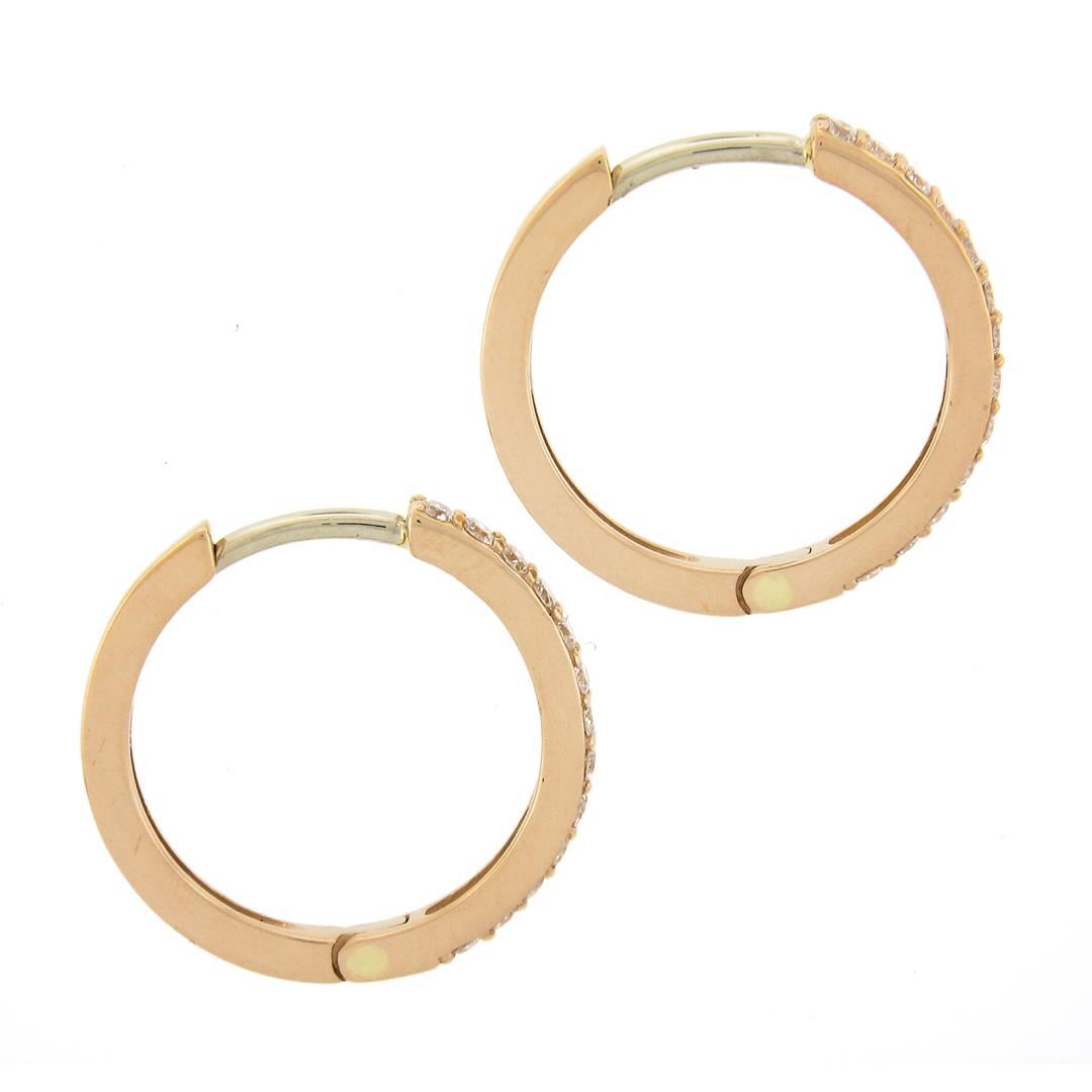 A new solid 14k rose gold hoop earrings, with 26 round brilliant cut natural diamonds (G/H - VS1/VS2 ; 0.26ctw). The earrings measure approximately 15.4x1.7mm and weigh a total of 1.88 grams.