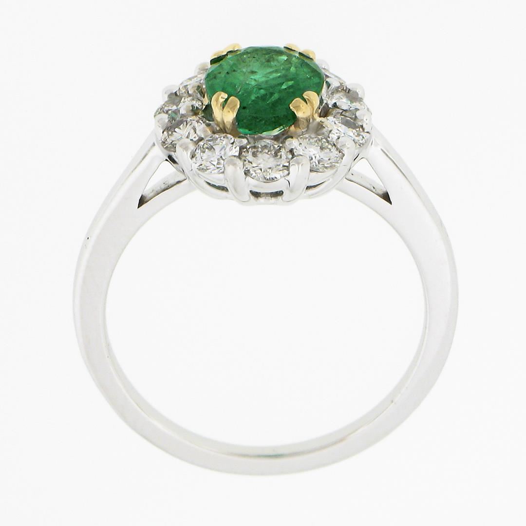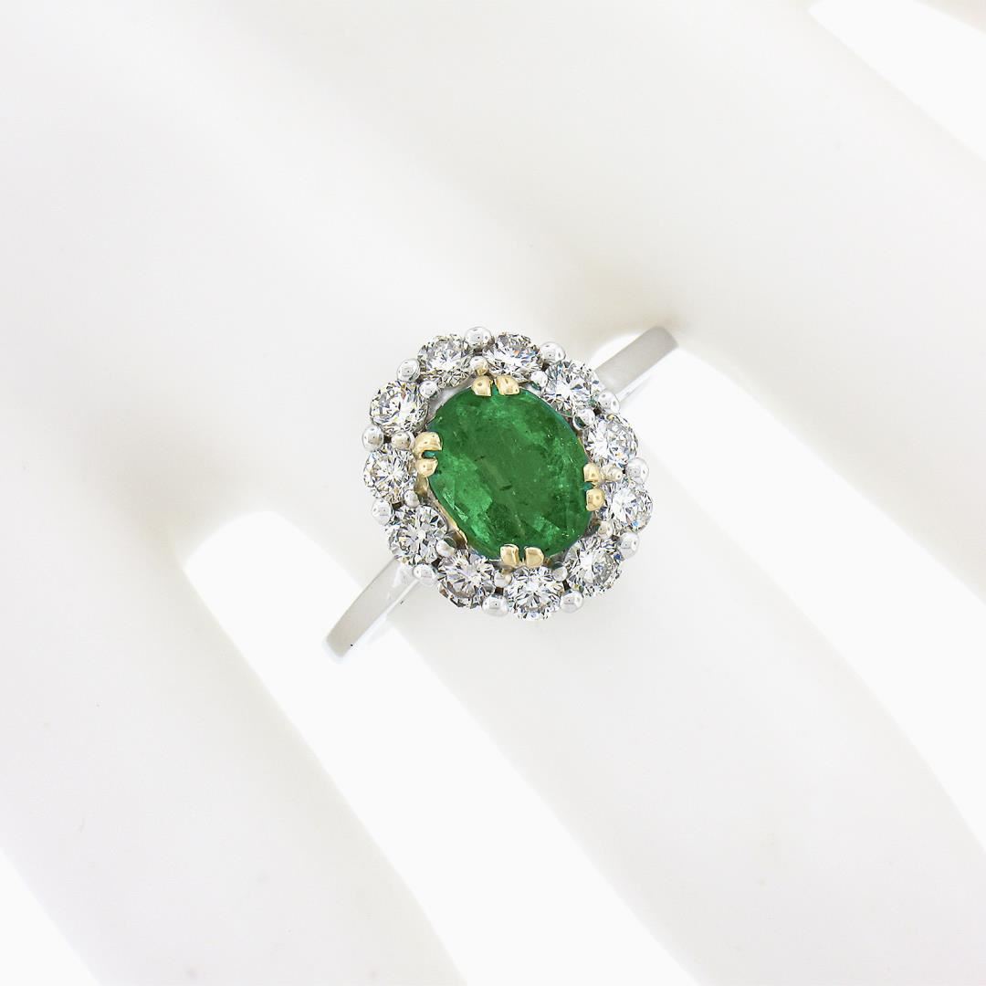 a new solid 18k yellow & white gold soliatire ring, with 1 oval cut natural emerald (1.38ct ), and a halo of 11 round brilliant cut natural diamonds (G/H - VS1/VS2 ; 0.73ctw). The ring is size 6.5, weighs a total of 4.25 grams, and measures 13mm wide.