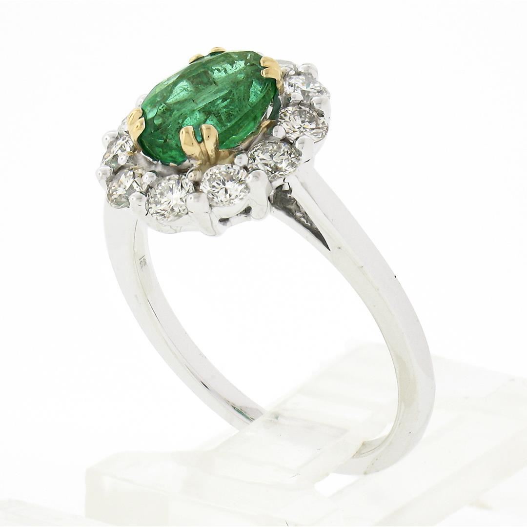 a new solid 18k yellow & white gold soliatire ring, with 1 oval cut natural emerald (1.38ct ), and a halo of 11 round brilliant cut natural diamonds (G/H - VS1/VS2 ; 0.73ctw). The ring is size 6.5, weighs a total of 4.25 grams, and measures 13mm wide.