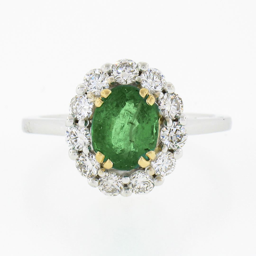 a new solid 18k yellow & white gold soliatire ring, with 1 oval cut natural emerald (1.38ct ), and a halo of 11 round brilliant cut natural diamonds (G/H - VS1/VS2 ; 0.73ctw). The ring is size 6.5, weighs a total of 4.25 grams, and measures 13mm wide.